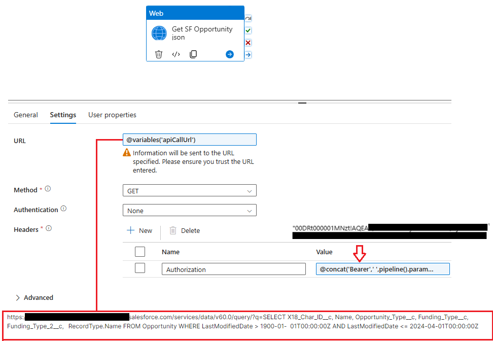 2. Use the Web task output (which is the bearer token) in a Web task GET as follows: