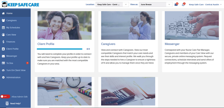After developing the minimum viable produce, the Project Balance team continued to build out the platform to include features for running a private duty agency through Keep Safe Care (keepsafecare.com). Customer relationship management features were added to assist agency owners to track clients through the sales pipeline and while on service. Caregiver management features were added as well as financial reporting for operational and tax purposes.